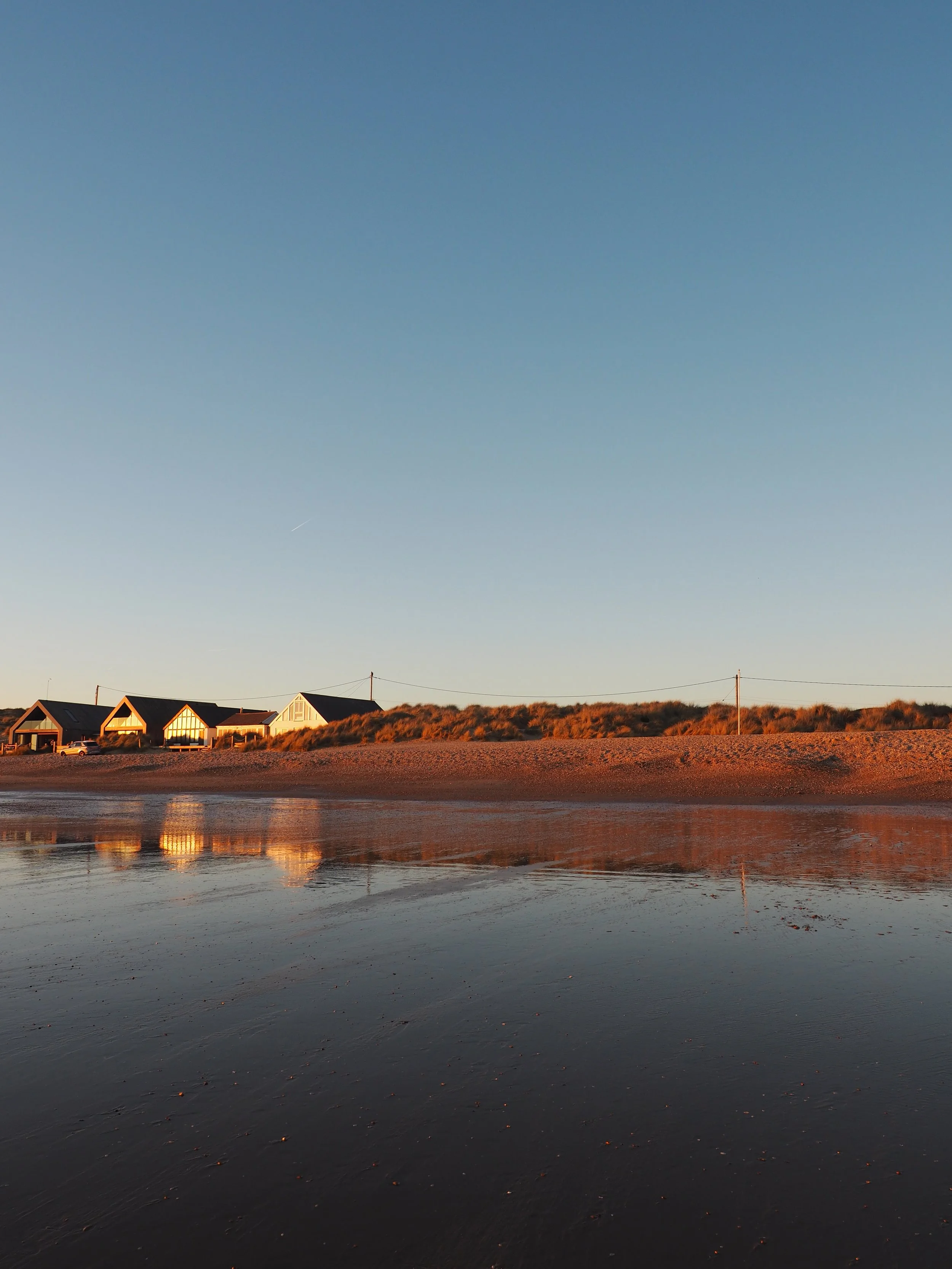 Sunset over a beach with houses, reflecting on the water, with sand dunes and power lines in the background.