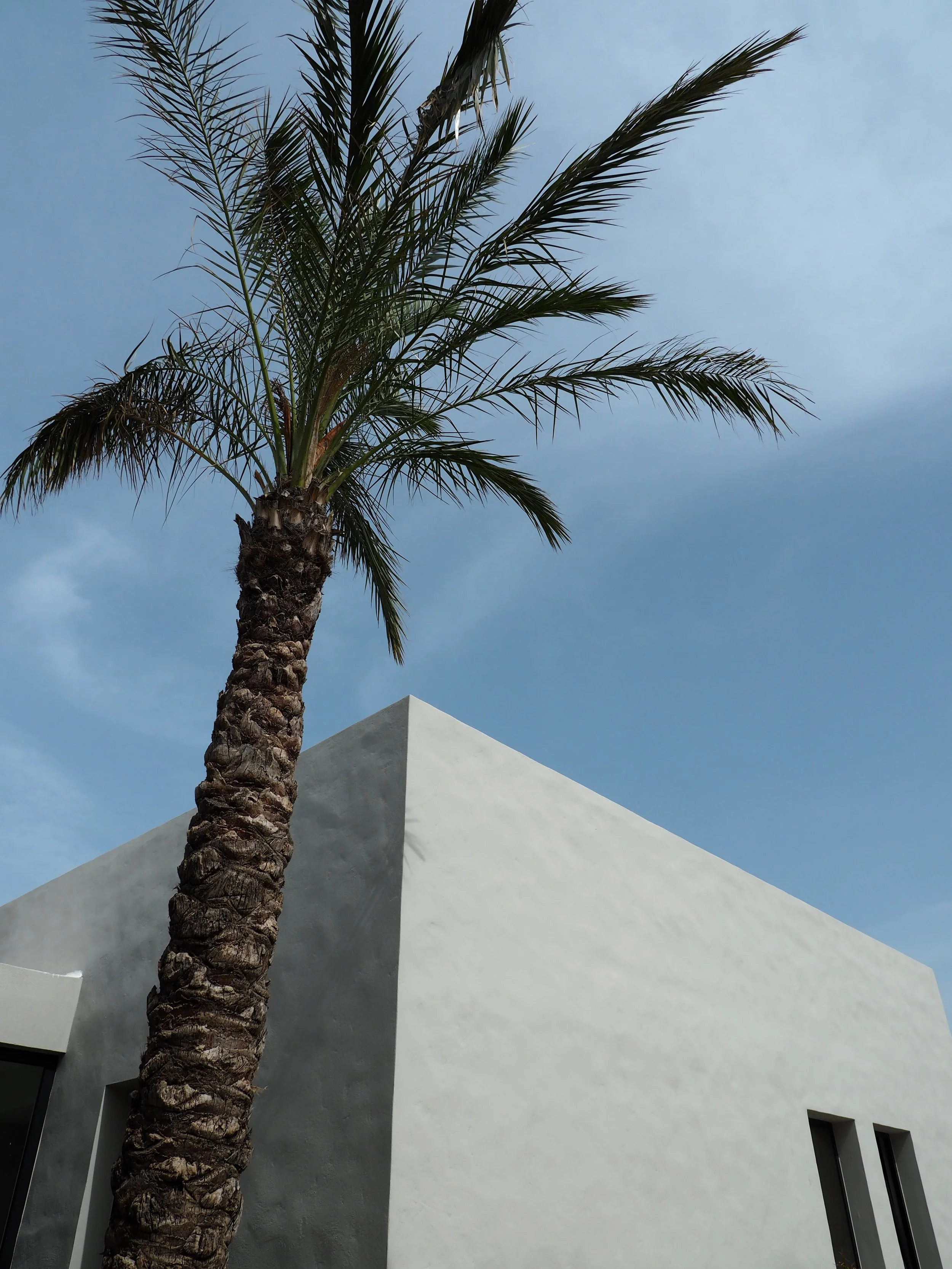 A tall palm tree next to a modern white building with a flat roof and narrow windows, set against a cloudy blue sky.