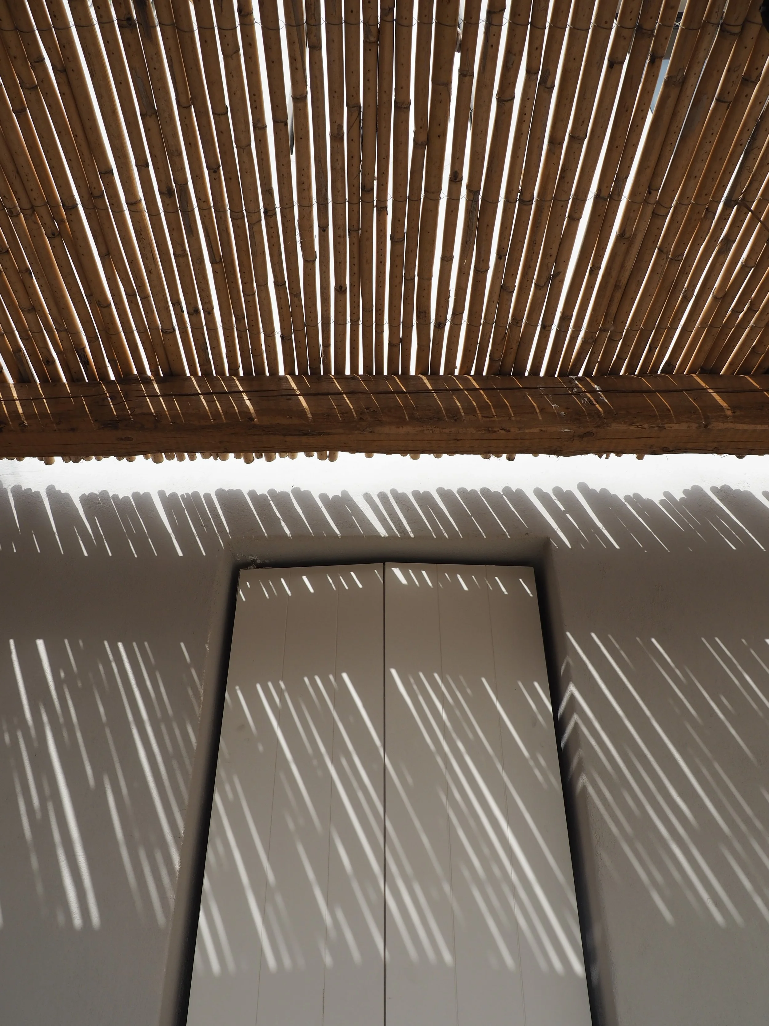 Sunlight passing through a bamboo ceiling, casting striped shadows on a wall and a door.